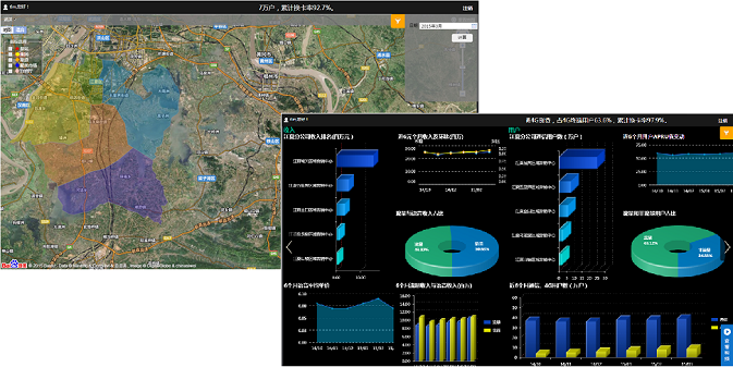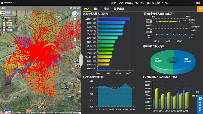 實(shí)時(shí)集中監(jiān)控平臺(tái)以簡(jiǎn)潔、美觀的圖表頁(yè)面,集中展現(xiàn)企業(yè)各環(huán)節(jié)經(jīng)營(yíng)數(shù)據(jù)。武漢移動(dòng)經(jīng)過(guò)多年信息化的建設(shè),已形成區(qū)域化的業(yè)務(wù)管理體系,并積累了大量的業(yè)務(wù)數(shù)據(jù)。為清晰呈現(xiàn)各項(xiàng)指標(biāo)在全市范圍內(nèi)不同區(qū)域的整體情況,億信BI通過(guò)在GIS地圖上對(duì)各區(qū)域模塊進(jìn)行顏色渲染,清晰展示企業(yè)業(yè)務(wù)區(qū)域的分布情況(如下圖左側(cè)所示),同時(shí)通過(guò)多TAB頁(yè)的展示方式(如下圖右側(cè)所示),以專(zhuān)題化(包括收入,用戶(hù)發(fā)展、4G發(fā)展等專(zhuān)題)的頁(yè)面,分析了各主題中不同項(xiàng)經(jīng)營(yíng)指標(biāo)的排名,占比,趨勢(shì)以及對(duì)比情況,從而使決策者可快速定位自己所關(guān)心的重點(diǎn)數(shù)據(jù)。