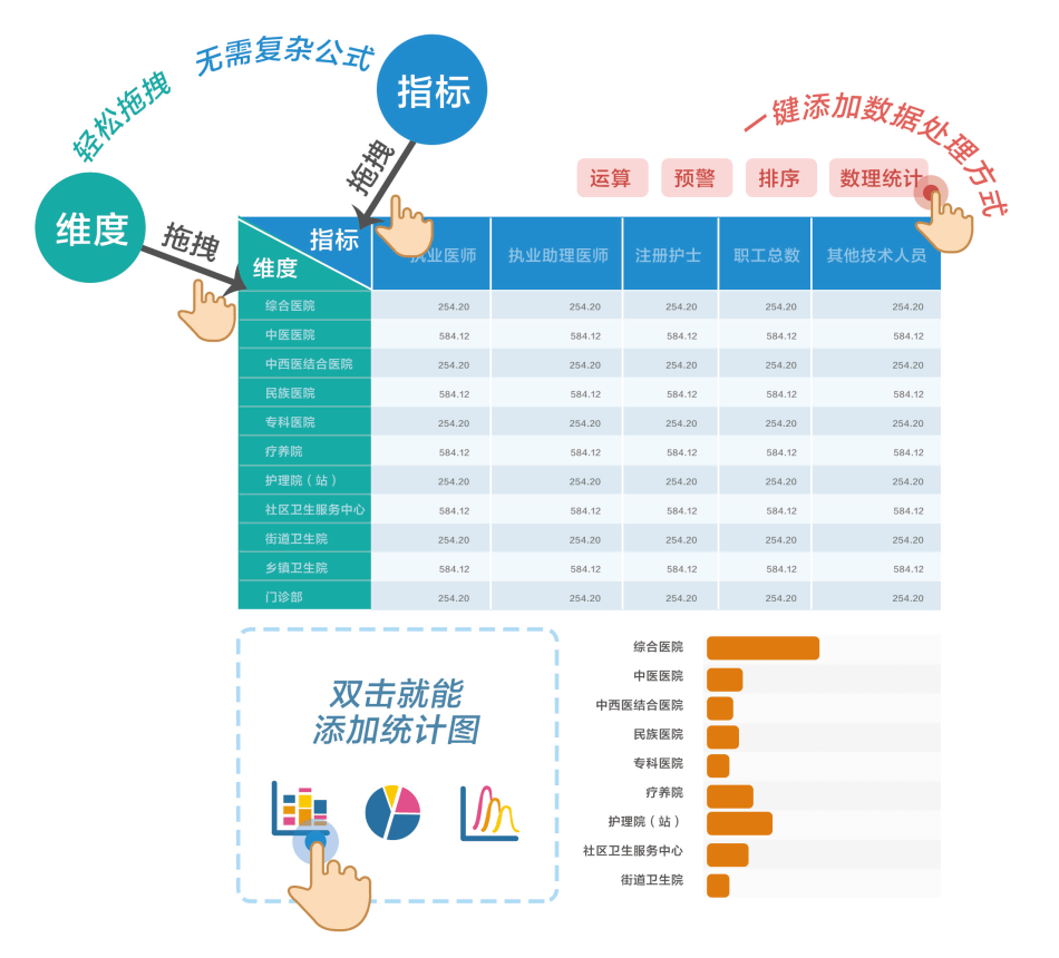 完全面向業(yè)務(wù)人員,充分理解當(dāng)下業(yè)務(wù)人員渴求自主探索數(shù)據(jù)的心情,只需要簡(jiǎn)單的鼠標(biāo)拖拽維度和指標(biāo),即可快速生成圖表。點(diǎn)選式數(shù)據(jù)預(yù)處理,智能的圖表推薦,全程無(wú)需編寫(xiě)表達(dá)式,零學(xué)習(xí)成本,一分鐘上手。敏捷看板中不僅內(nèi)置多種數(shù)據(jù)統(tǒng)計(jì)函數(shù),如:求和,最大值,排名,同比、環(huán)比、上期等,而且支持自定義維度和指標(biāo),兩者可以一鍵切換,靈活簡(jiǎn)便的分析方式,方便用戶進(jìn)行猜想式、求證式的數(shù)據(jù)探索。