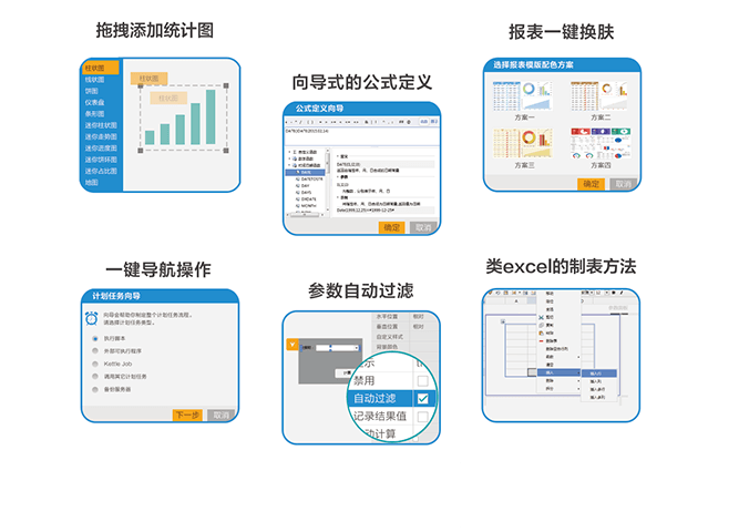 純Web的報表設計器,類Excel的操作方式,所有操作無需定義復雜公式,僅需拖拉圖表、參數,指標拾取即可快速完成各類報表。