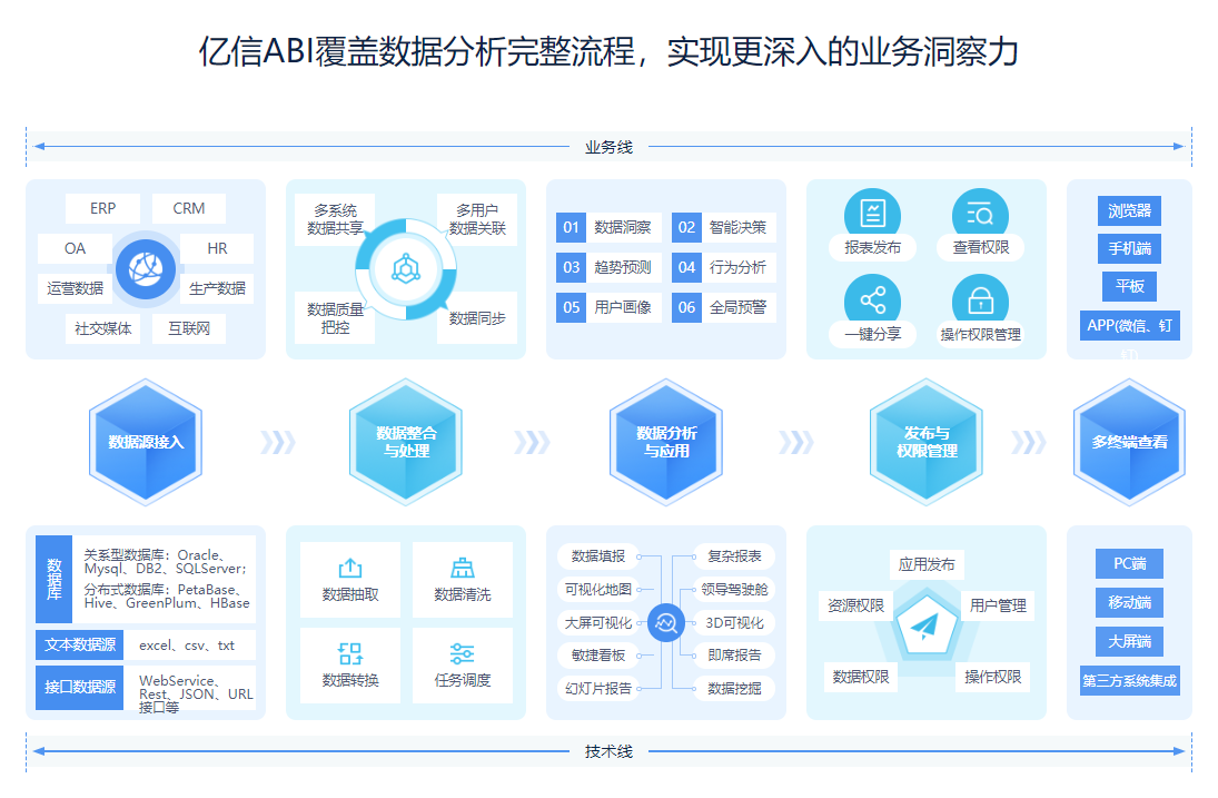 在這個信息爆炸式增長的時代,挖掘數據的潛在價值尤為重要,越來越多的人將目光聚集于商務智能BI領域。通過數據分析軟件對來自不同的數據源進行統一的處理和管理,并以靈活的方式展示數據之間的聯系,輔助企業進行決策。 在BI越發重要的今天,如何學習BI應用并熟練掌握它呢?總結一下,大致需要從五個方向著手: 1、學習數據庫知識,掌握基礎技能sql 直白來講,BI就是玩數據的,從數據中獲取各種所需信息。因為BI的出發點是數據,希望能夠從數據分析中得到有價值的信息,所以從事BI相關的工作是絕對離不開數據庫的。 2、技術方面,學習數據倉庫/ETL以及前端開發 那么,為什么要學習數據倉庫呢?首先,我們認識一下數據倉庫。 數據倉庫,是為企業所有級別的決策制定過程,提供所有數據類型支持的戰略集合。它出于分析性報告和決策目的而創建,為需要業務智能的企業,提供指導業務流程改進、監視時間、成本、質量以及合理控制它們。從數據倉庫的定義以及作用可以看出它和BI的作用完美契合,是BI的核心組成部分。 數據倉庫和數據庫僅有一字之差,但它們的作用卻不相同。數據倉庫和數據庫的區別實際來講就是OLTP和OLAP的區別。傳統數據庫系統主要是用聯機事務處理OLTP(OnLine Transaction Processing),也叫操作型處理,它是針對具體業務在數據庫聯機的日常操作,通常對少數記錄進行增刪改查。用戶較為關心操作的響應時間,數據的安全性完整性以及并發支持的用戶數等問題。而數據倉庫使用的就是OLAP(OnLine Analytical Processing)了,也叫分析型處理,一般是針對某些主題的歷史數據進行分析,提供可靠結論以便支持決策管理。 數據倉庫學習了解后,接下來要學習ETL(Extract - Transform-Load)。ETL是數據倉庫的后臺,主要包含數據的抽取、清洗、規范化以及提交四個步驟。它是將數據從源系統加載到數據倉庫的過程。用來描述講數據從來源端經過萃取(extract)、轉置(transform)、加載(load)至目的端的過程。ETL一詞較常用在數據倉庫,但其對象并不限于數據倉庫。從OLTP(聯機事務處理)數據庫中提取數據,將其轉換為與數據倉庫模式匹配并加載到數據倉庫中。 數據倉庫作為提供所有數據類型支持的戰略集合,對于BI分析數據模型是至關重要的,而ETL從數據庫中提取,清洗數據加載到數據倉庫中,作為連接數據庫和數據倉庫的紐帶,在我們想要學好BI的前提下,學習ETL也是必不可少的。 當然,這些都是數據層面(底層)的東西,里子有了,當然面子也需要做好。對于BI來講,數據分析后,我們很有必要將分析得到的結果以清晰炫酷的方式展現出來,做到第一時間抓住人們的眼球。這就需要我們有良好的前臺代碼基礎。 3、選擇技術工具 一個好的工具,可以幫助我們快速牢固的掌握所需技能。 作為一款全能型數據分析工具,億信ABI不僅支持連接類似oracle、mysql之類的數據庫,還支持類似文件數據或者網絡接口數據,數據來源支持廣泛;億信ABI的分析方式也很豐富,可以滿足市場上的各種場景需求,不論是中國式復雜報表,還是類似天貓雙十一作戰大屏的交互式炫酷效果,它都能實現;億信ABI系統的擴展性和穩定性都很OK,對于大數據量的數據分析,實現系統的線性擴展的同時保證良好的系統穩定性;大數據時代,對數據處理的能力要求也變的更高,億信ABI就實現了千萬、千億甚至更大數據量數據的秒級響應。 作為行業內頂尖的一款BI工具,億信ABI可以很好地幫助我們學習BI,還可以免費試用呢。 4、學習業務知識 學習相關業務知識,任何行業都有屬于它自己的業務知識。 學習BI,我們要知道業務中的一些專業名詞,比如指標、維度、主題域、主體集、主題表等等,以及業務中的一些具體邏輯,這些對于我們在做BI分析的時候都是十分重要的。 5、實操數據分析工作 紙上學來終覺淺。在理論知識學好的情況下,更加注重的就是實踐了。在實際項目中認真參與,實操數據分析工作,把理論知識融會貫通。 相信只要能夠做好上面的五個方面,我們一定能夠擺脫菜鳥身份,向BI領域的大牛發起沖擊。