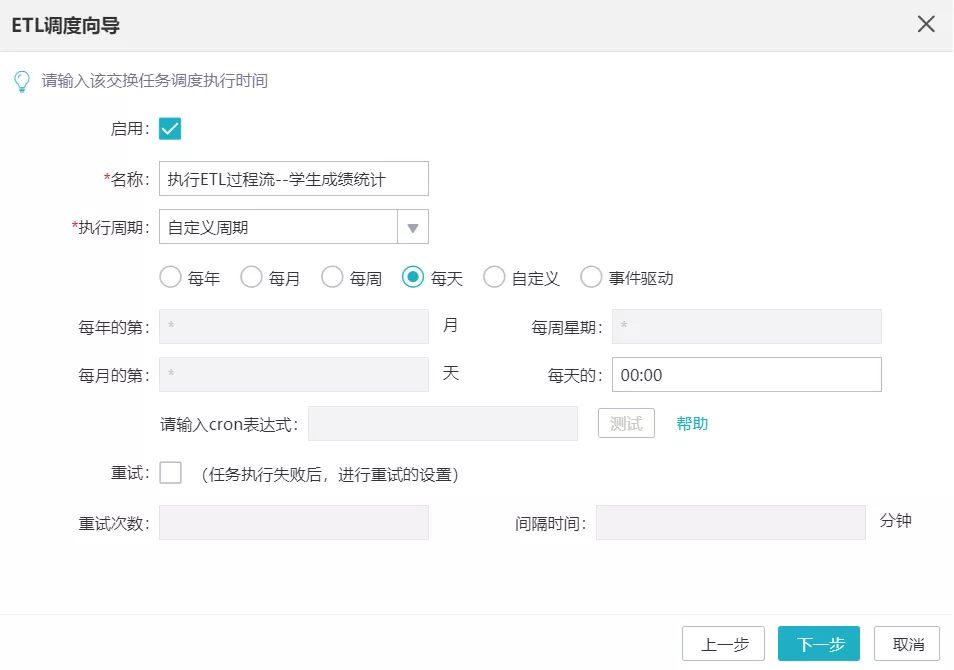 一般情況下,ETL過程都會伴隨著調(diào)度任務(wù)的設(shè)置。比如,某銷售部門需要每周五抽取數(shù)據(jù)計算當(dāng)周銷售利潤用于匯報,如果利用ETL實現(xiàn),時間調(diào)度管理必不可少。億信ABI的ETL調(diào)度導(dǎo)向,深度考慮各使用場景,用戶只需簡單操作,即可實現(xiàn)復(fù)雜的調(diào)度任務(wù)。