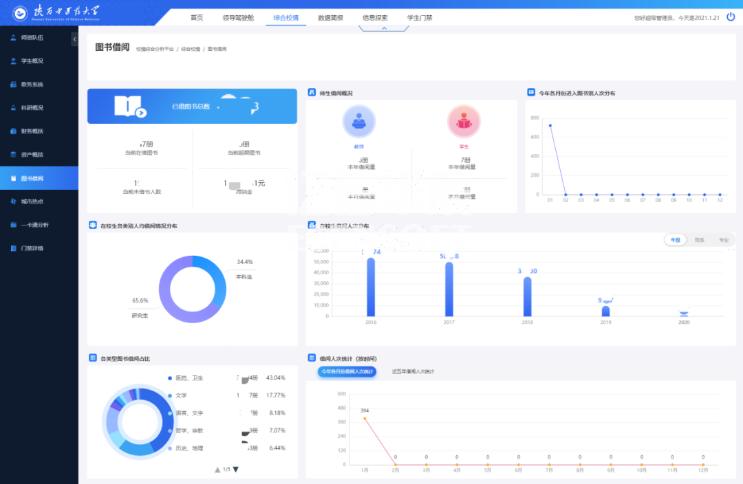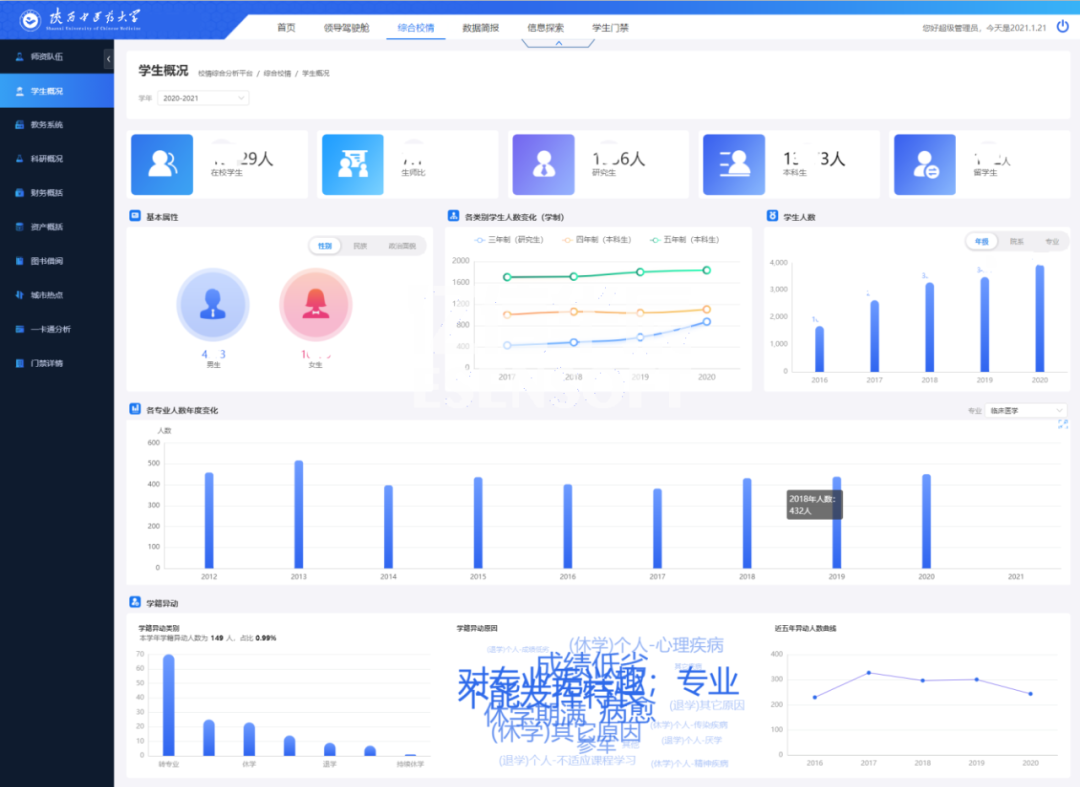 陜西中醫(yī)藥大學利用億信ABI建設了統(tǒng)一的校情綜合分析平臺,涉及內(nèi)容包括首頁、領導駕駛艙、綜合校情、數(shù)據(jù)簡報、信息探索和學生門禁等各項內(nèi)容。通過數(shù)據(jù)化運營改進數(shù)據(jù)收集和管理方式,用數(shù)據(jù)驅(qū)動業(yè)務,對業(yè)務數(shù)據(jù)進行可視化分析,以提升學校管理水平和服務能力。
