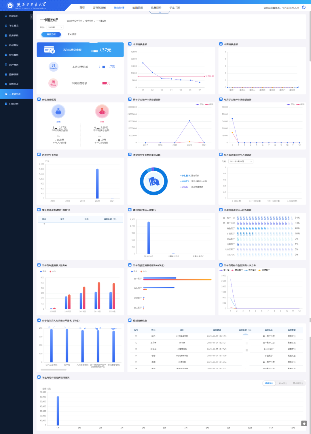 一卡通分析頁面通過對全校師生消費和卡片進行分析,可以讓學校管理者對在校師生的消費情況和規(guī)律有一個量化的認識,從而能夠合理地分配資源,降低管理成本,這對校園的規(guī)劃建設和學校學生管理工作都具有重要的作用。如下圖:
