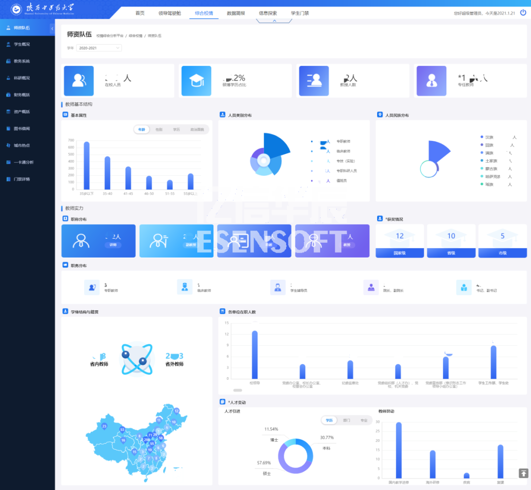 豐富的校情可視化數(shù)據(jù)看板 在綜合校情查詢與主題分析角度,對教務教學、科研、資產(chǎn)、財務、人事與學生管理、一卡通等業(yè)務,進行結構、趨勢、分布等綜合分析,讓各級領導一屏在手,掌握全局,多種指標實時隨地呈現(xiàn),助力科學決策。 師資隊伍 高校師資隊伍建設的優(yōu)劣決定了高校人才培養(yǎng)質(zhì)量的高低。如何在大數(shù)據(jù)時代科學利用源于高校各個層面的海量數(shù)據(jù),并使之成為高校師資隊伍建設的參考與方向,是眾多高校需要解決的問題。師資隊伍頁面通過展現(xiàn)教職工主要的屬性指標,分析了目前高校師資隊伍建設中所存在的問題,對加強高校師資隊伍建設起到指導作用。如下圖: