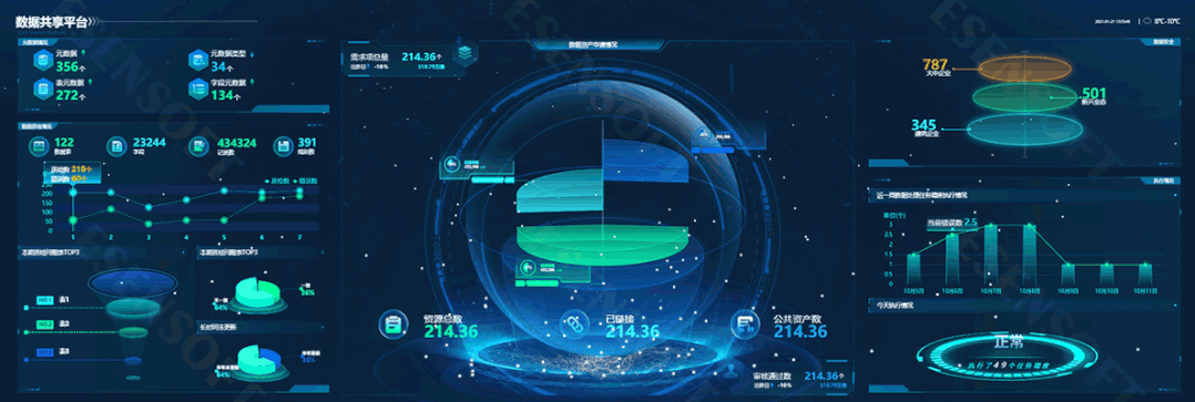 展現邏輯:實時展示數據資產申請情況、元數據情況、數據質檢情況、數據安全、執行情況等信息,并添加大量的動畫效果使其充滿科幻感。