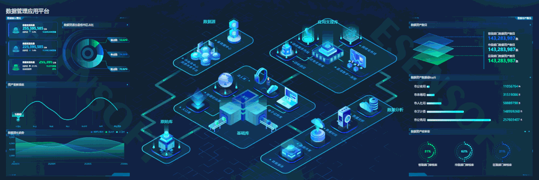 展現邏輯:中心以動畫效果展示數據管理應用的整個流程,實時展示數據接入情況、數據增長趨勢、數據資產概況等信息。