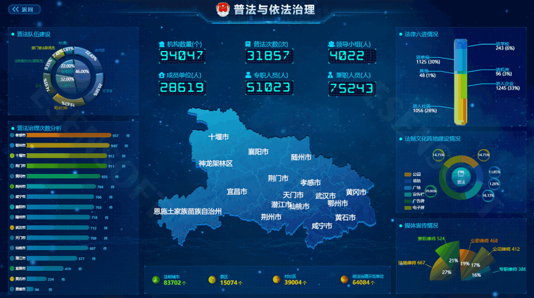 —TOP 2— 法制宣傳大屏 最佳分辨率:1920*1080 使用場景:了解普法工作的推進情況,包括隊伍建設、媒體宣傳、各個縣市的大數據對比等,對于有法制宣傳,法律服務等需求的行業提供大屏承載方案,助其成為暢通社情民意、服務保障民生的監管新陣地。 展現邏輯:使用樣式各異的圖表,展示法律行業內的不同需求的數據,根據地理位置等信息數據,直觀、便捷的展現數據結果,讓人一目了然。